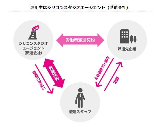 シリコンスタジオエージェント公式サイト内で掲載されている図解で、わかりやすく派遣社員の雇用関係について紹介されております。